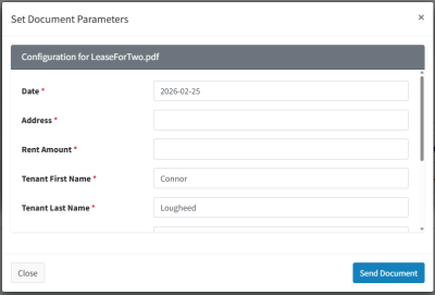 The exact parameters that are displayed will depend on your specific document. In this example, I’m send a lease, so we have a date, address, rent amount, tenant first/last names, etc.