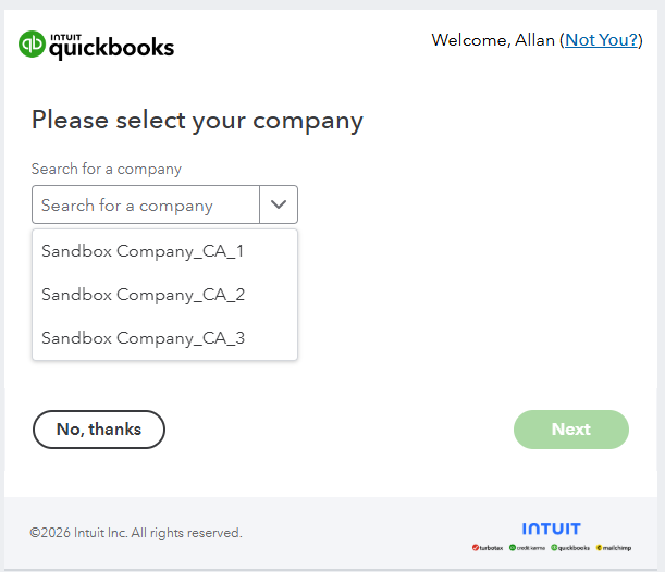 Next, you’ll be presented with a list of all of your QuickBooks companies.  We can only connect one at a time, so choose the first one you’d like to connect, then click the Next button.