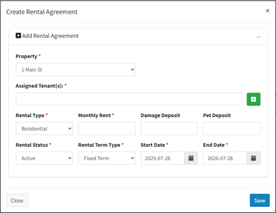 Assign the tenant, set the rental type (residential or commercial), add in the monthly rent, then set the start / end dates of the lease. You can choose Month-to-Month for rental type if you need.