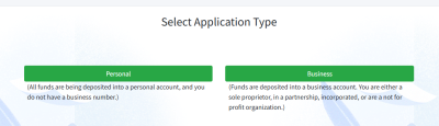 Next, you’ll select what kind of application this is. If you will be receiving funds to a personal bank account, choose the personal option. If you will be receiving funds to a business or corporate bank account, choose the business option.