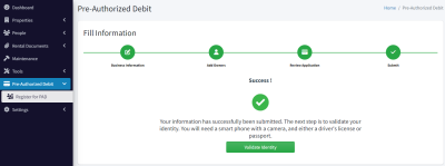 This article will take you through the process of adding a property, tenant, and rental agreement. Then, applying for pre-authorized debit and finally setting up your first monthly rent payment.