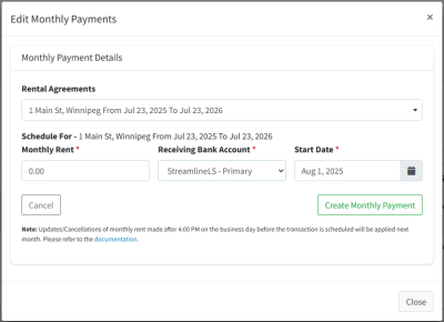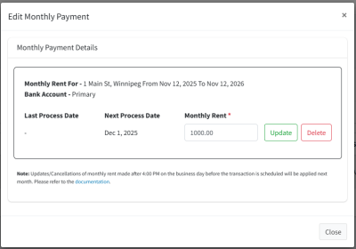 The monthly rent is now set up. If you need to update the amount, you would do it here, in this dialog. This is also where you can cancel the monthly rent when the tenant moves out.