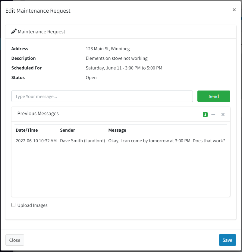 Once you click the save button, a notification is sent to your landlord that you have created this request. If you edit the request, notice that you can add messages to go along with the original description. Use this area to discuss the issue and determine a time for the landlord to resolve the issue. This may involve a 3rd party contractor coming to your residence and fixing the problem.
